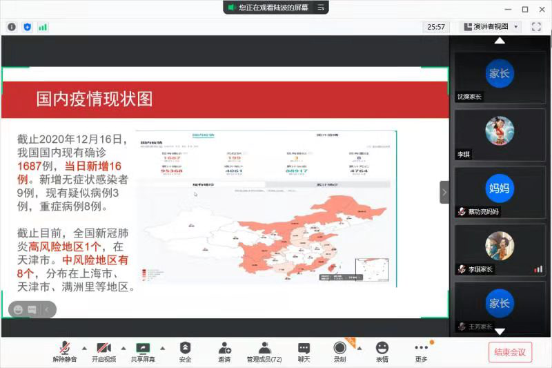 (通讯员:李灿阳 明正梁)为进一步加强假期安全防控,降低疫情反弹风险,落实假前学生安全教育工作。动科学院各班级于12月16日晚7:00在腾讯会议召开寒假安全与疫情防控安全教育主题会议。学生家长参加了此次的会议。