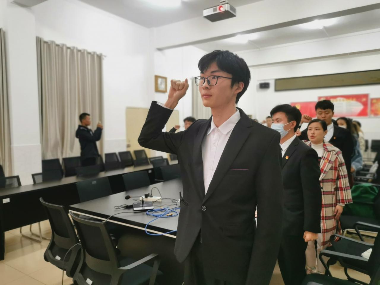 随后,老团员向新团员颁发团章、团员证和团徽,并将团徽佩戴在左胸前,由老团员代表刘永清作为领誓人带领全体团员进行宣誓。全体团员面向团旗立正,右手握拳,举过右肩,领誓人逐句领读入团誓词,宣誓人跟读,当念到“宣誓人”时,全体团员分别报出自己的姓名。