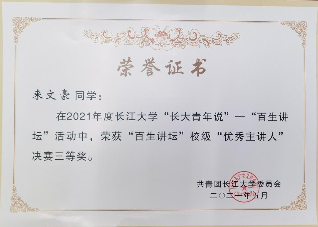 为庆祝中国共产党成立100周年,进一步推进习近平新时代中国特色社会主义思想进支部、进社团、进网络、进团课,2021年5月13日下午,百生讲坛”优秀主讲人决赛暨示范巡讲在太阳集团7237网站东校区12教405拉开帷幕,太阳集团7237网站来文豪荣同学获校级“优秀主讲人”决赛三等奖。