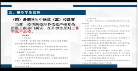 班会主要分为四部分内容,首先通报当前国家及湖北疫情动态,强调防疫的重要性,然后宣传国家、地方及学校的相关防疫政策,让学生们了解相关内容。第三部分,是当前学校疫情防控管理内容,主要分为校内学生管理和校外学生管理,要求全体研究生非必要不外出,积极接种疫苗,如实报告疫苗注射情况,坚持学院和学校的辅导猫健康打卡,原则上不前往中高风险地区,避免旅途感染风险。同时,此次会议还对学生离返校申请流程和后续秋季开学返校安排进行了说明。从即日起,各学院启动不少于21日的连续健康打卡,否则不予审批返校申请。学生返校必须履行申请审批手续,未经学院及学校批准,研究生不得提前返校。