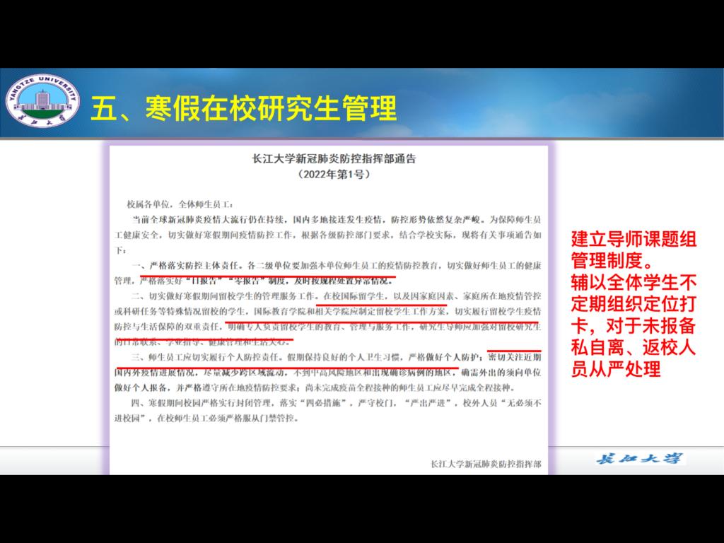 会议分为三部分进行。首先,向研究生说明寒假放假时间安排、在校人员情况及假期人身、财产安全,在校学生要注意实验室、宿舍安全,发现问题及时上报,让同学们对自身安全引起重视。其次,向研究生说明延迟离校、提前返校要求,实行申请审批制,导师为第一责任人,提醒同学们服从管理,认真遵守校规校纪。最后,向研究生讲解延迟离校研究生管理办法,以导师课题组为单位,每个课题组选出一位负责人管理其他成员,定期汇报在校情况,辅以不定期全员定位打卡,做到全员、全方位管理。另外,提醒同学们加强第三针疫苗的接种,做好自我防护措施。