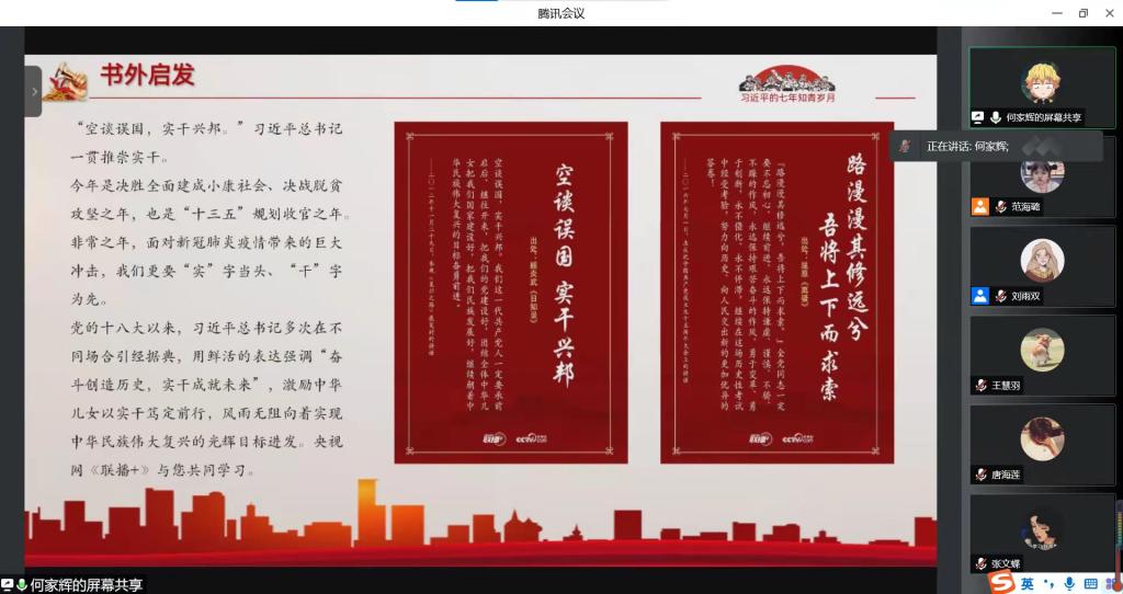 马春林在介绍青年习近平对“耕读不辍”这一中华优秀文化传统力行的基础上,分析了青年习近平在艰苦条件下坚持读书学习的特点,即不带任何功利性的博览群书,注重对马克思主义理论的学习,采取比较分析读书的方法,重视知行合一、行胜于言等。何家辉则引用名言“为天地立心,为生民立命,为往圣继绝学,为万世开太平”强调习近平总书记的谋事干事精神,他说道:“身为新时代的青年,我们要把谋事干事的精神熔铸在家国情怀的升华中,能够真正实现从小我走向大我,以自我的实干来实现国家的发展和富强。”