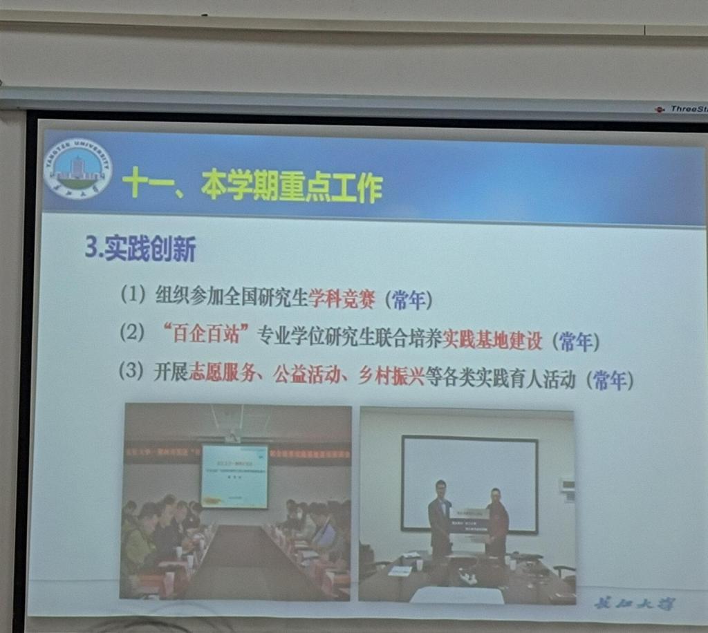 随后,辅导员杨湘虹老师带领大家学习了本学期的研究生思想政治教育、学术文化与学术道德建设、实践创新以及安全管理等方面的具体活动及要求。