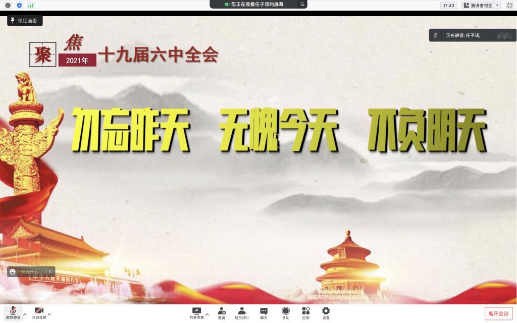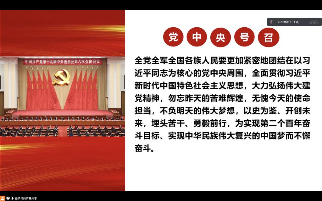 通讯员黄玲玲 吴广421日中午2动科学院在线上开展以勿忘昨天无愧今天不负明天为主题的中共十九届六中全会相关内容的学习活动参与本次活动的有动科学院青马学习小组全体成员20级与21级各班的团支书以及20级的预备党员本次活动由学习科创部部长任子诺担任主讲人同时还邀请到了团委书记王海洋老师