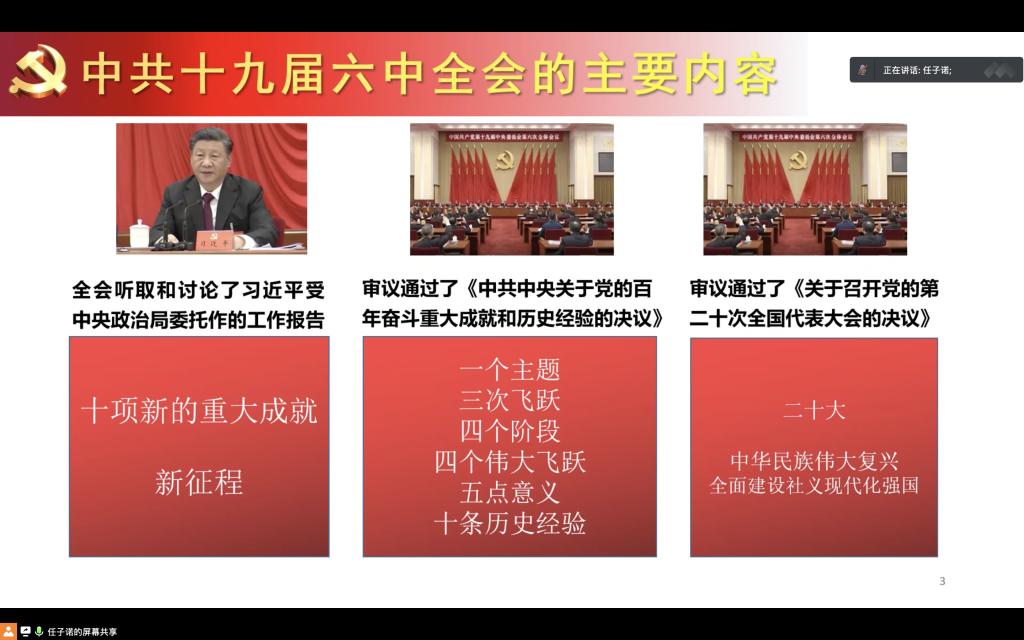 总结党的百年奋斗重大成就和历史经验方能更好地发展未来六中全会通过了我们党历史上的第三个决议”,总结了党的百年奋斗重大成就以及历史经验对于这一模块的讲解任子诺就背景条件重大成就历史经验工作安排四个方面开展对我们党在四个不同的时期阶段制定的主要任务以及形成的思想理论进行了详细讲解同时他又对将于北京召开的中共二十大进行了简单的讲解他认为每一场重大会议的召开都具有时代性的作用身为动科学子我们要做的就是认真学习这些会议精神响应党的号召坚定不移跟党走