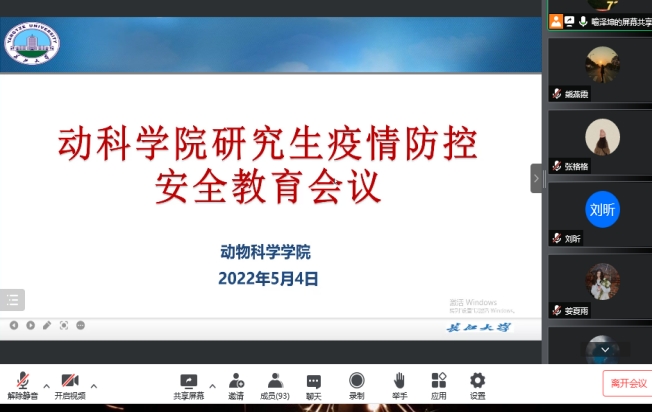 (通讯员:喻泽坤)为进一步落实学校疫情防控要求,做好疫情防控工作,增强疫情防控实效,动物科学学院于2022年5月12日-15日陆续以班级为单位、以线上线下相结合形式组织开展疫情防控专题教育班会。