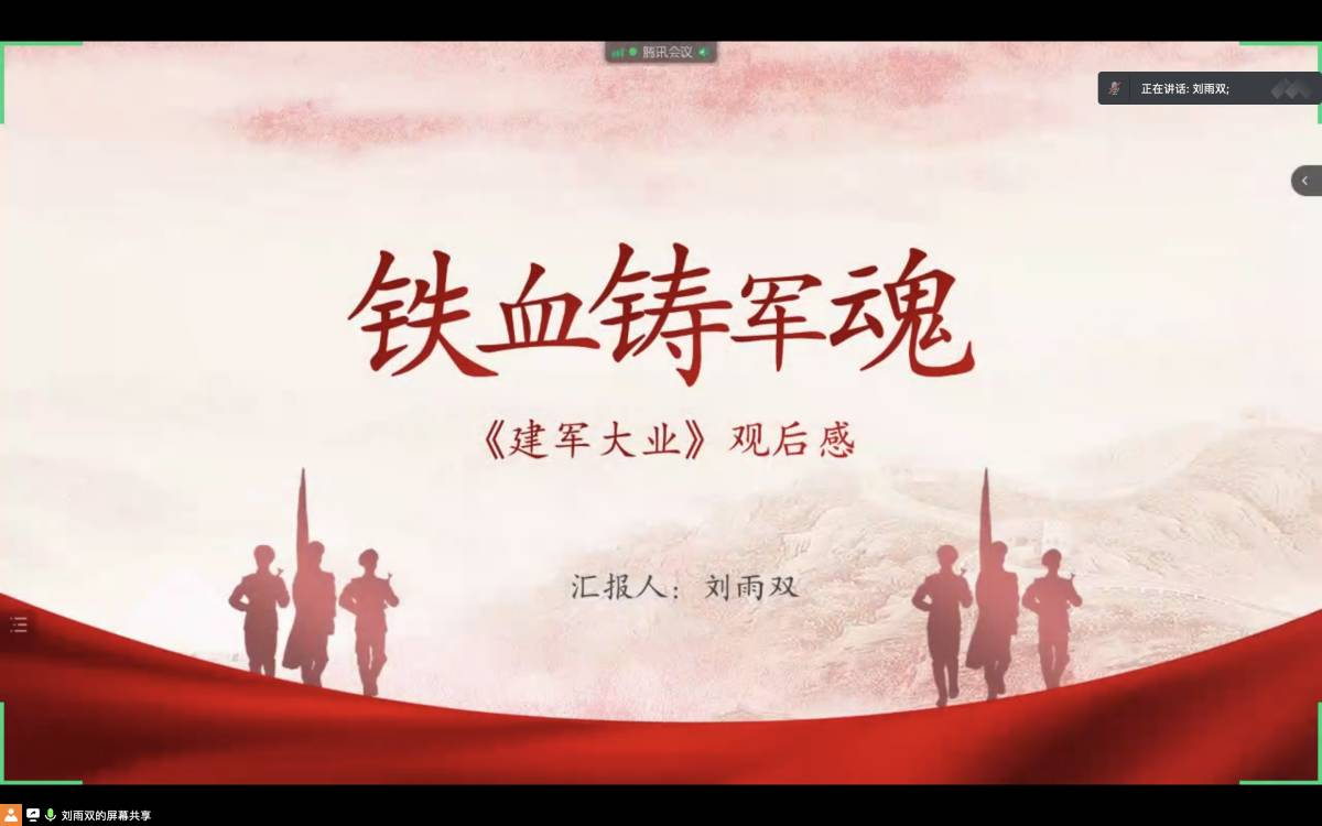 活动开始,组员们依次分享了他们在这段时间里所获得的感悟与收获,其中先辈们的付出是最令人难以忘怀的,刘雨双在观看电影《建军大业》后感叹道:“对于我们参加起义的革命战士们,他们也像毛泽东同志一样,毅然决然的参加了革命,战死在前线,为中华民族崛起做出了生命的贡献。我不由得感慨,我们是多么的幸福,不用经历妻离子散,不用经历家破人亡。”黄玲玲则通过《金刚川》这部电影对我国人民志愿军称赞道:“在祖国的召唤下,他们义无反顾扛枪上阵,难道他们不怕吗,流血、牺牲…不,他们知道,和平安宁的国家才会造就美好幸福的生活。”在每个人分享自身深刻感悟的同时,其它组员认真聆听记录,
